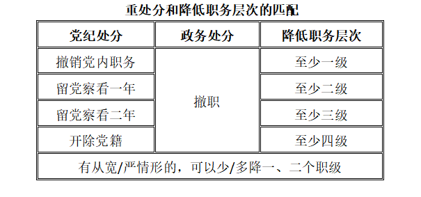 2.對(duì)擬給予撤職處分的黨員干部,應(yīng)按照擬給予其黨紀(jì)重處分的不同檔次,即撤銷黨內(nèi)職務(wù)、留黨察看一年、留黨察看二年和開除黨籍等四檔,由輕及重,區(qū)別對(duì)待,分別提出降低至少一個(gè)至四個(gè)職務(wù)層次的建議。降低職級(jí)的幅度應(yīng)當(dāng)綜合考慮職務(wù)層次和職級(jí)之間的對(duì)應(yīng)關(guān)系,調(diào)整后的職級(jí)一般應(yīng)當(dāng)為調(diào)整后相應(yīng)職務(wù)層次所對(duì)應(yīng)的最低職級(jí)。對(duì)適用從寬或者從嚴(yán)把握情形的,可以少降或者多降一至二個(gè)職級(jí)。